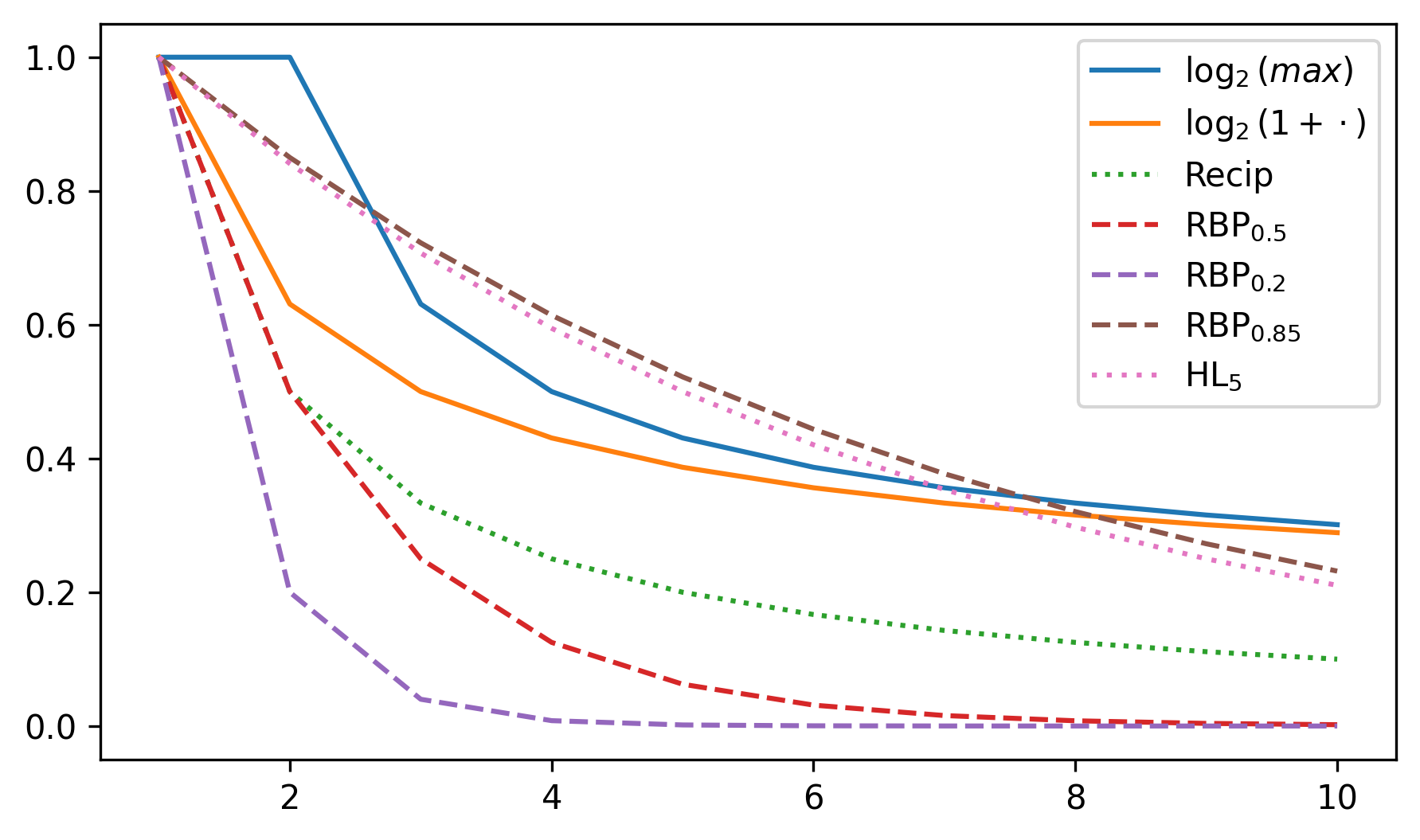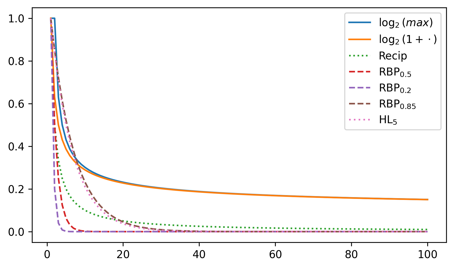 - Logarithmic discounting (typically base-2, used in NDCG)